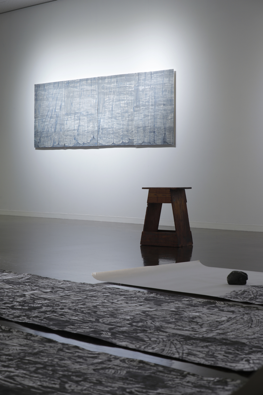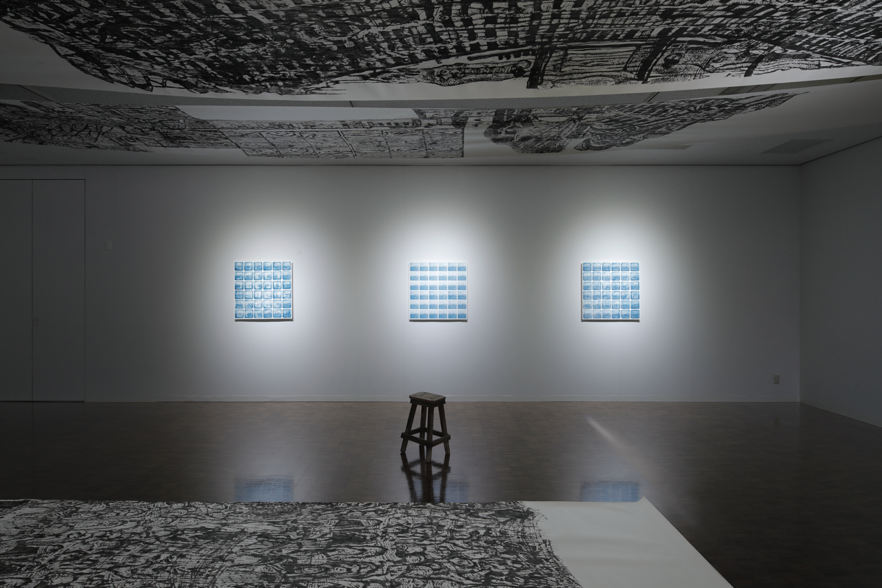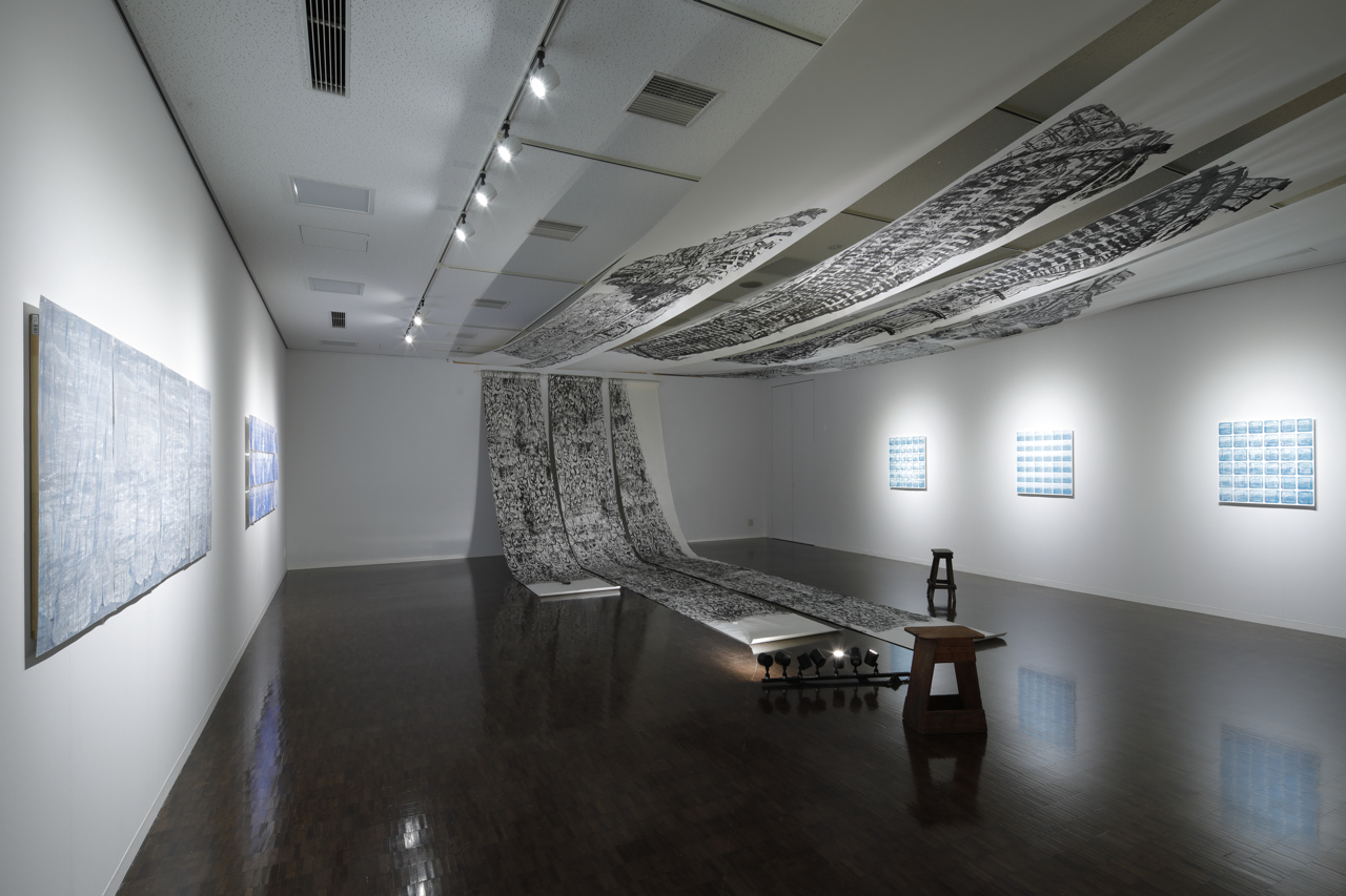 中桐聡美と山田真実による二人展。展覧会名にある「測鉛」とは、海の深さを測るための装置で、目盛や紐を施した綱の先につけて下ろす鉛製の重りのことだ。海へずんずん入っていく鉛によって、その深さを観察者に知らせる。本展において、その鉛は、木版画やシルクスクリーンにおけるインクが紙に押し付けられ、孔という境界を通り抜けて形を生むこと、境界を超えて相互の関係性を測り合うことと重ね合わされている。さらには、二人の取り組みもまた互いの測鉛のようだ。