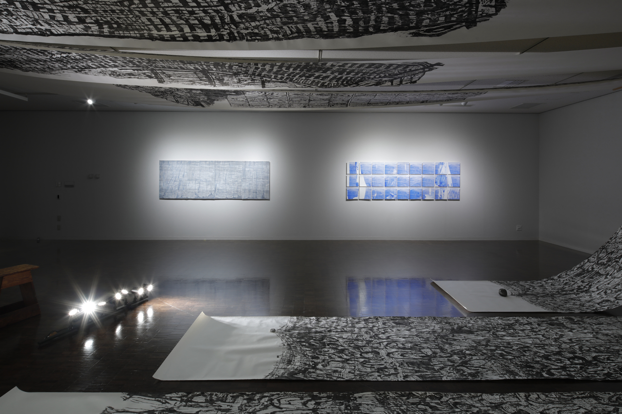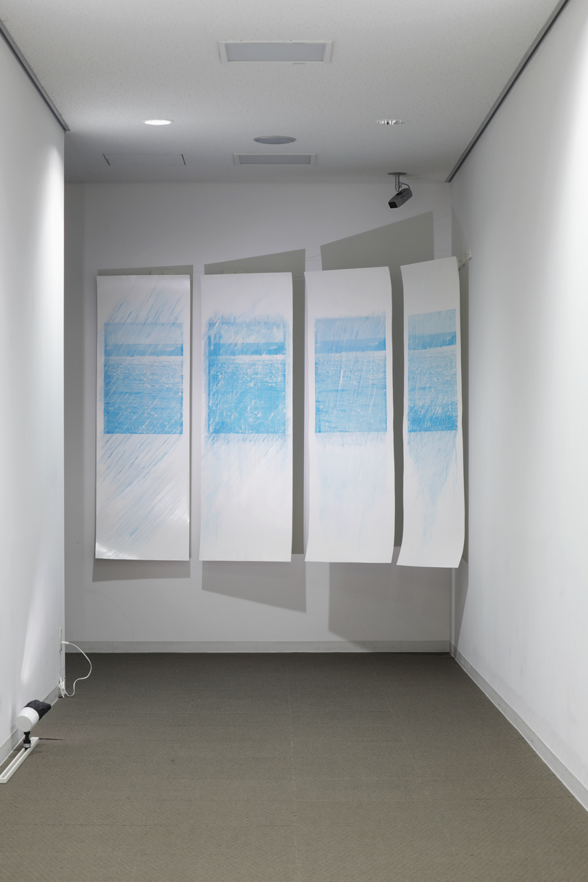 瀬戸内海でシルクスクリーンの写真にカッターナイフでドローイングを重ねる中桐と、琵琶湖で凹凸版をベースに木版画に取り組む山田。アール・ヌーヴォーに由来を持ち現在も世界中で使われているガラスブロックの窓から覗き込んで見える海の風景写真を窓ごとに刷って見せる中桐と、主に江戸時代に使用され蒸気船の就航とともに姿を消した、琵琶湖の浅さに特化した形を持つ丸子船を彫り刷る山田。技法の違いがどのように対象との関係の結び方を変えるのか、あるいは各々の関心がいかに技法を選び取らせたか、使わせるかといった視点が鑑賞者に与えられる。とはいうものの、両者の作品やリサーチの軌跡が展覧会会場の中でパッキリと分けられているわけではない。それらの混在によって、鑑賞者は事後的にこの対比の強さに気付くことになるだろう。そして鑑賞者は思うのではないだろうか。二人は互いをどう思っているのだろうかと。