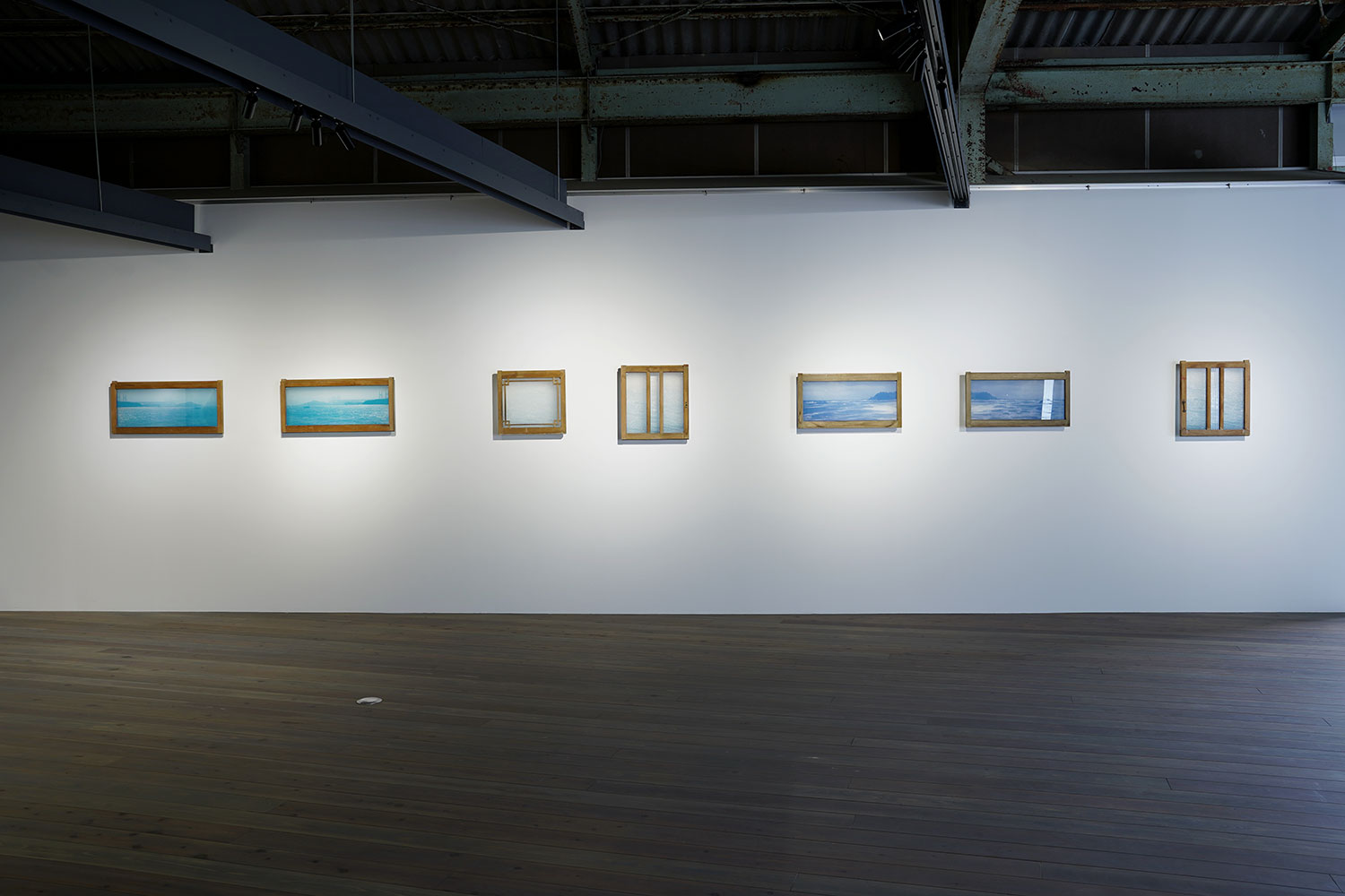 中桐の作品における水平、それはまず転写されるイメージと関わっている。中桐が2020年以来制作を続ける一連の作品は彼女が育った岡山の海を撮影した一枚の写真をもとにしており、画面の下半分には海が写っている。きらめくさざなみ、沖合の船、橋の橋脚と遠くに浮かび上がる島影。注意深く眺めるならばそこには瀬戸内海という海の広がり、水平的な風景が写し出されていることが理解できるだろう。中桐はこのイメージを反復して使