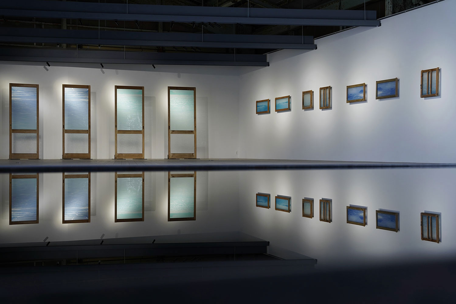 測鉛とは聞き慣れない言葉であるが、「綱の先に鉛をつけ、水中に投げ入れて水深を測る器具」のことだ。この喚起的な言葉から私たちは直ちに中桐の作品の本質と関わるテーマを取り出すことができる。すなわち測鉛とは海や湖といった水平の対象に対して常に垂直に投下される。水平と垂直の軸性は中桐の作品を読み解く鍵ではなかろうか。